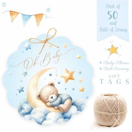 ₹175.00Original price was: ₹175.00.₹175.00Current price is: ₹175.00.Pack of 50 ‘Oh Baby’ Gift Tags for Baby Shower / Birth Ceremony / Baby Celebration’ – in an adorable pastel blue watercolour design. The pastel colour is suitable for both boy and girl celebrations and are perfect tags for all types of return gifts. They will also perfectly compliment the boxes of your savouries such as cakes, brownies, cupcakes, chocolates, candies, muffins, ladoos and other mithai. Printed on 350 GSM high-quality paper. A ball of string is supplied with each set of gift tags. All tags have pre-punched holes to attach the string.