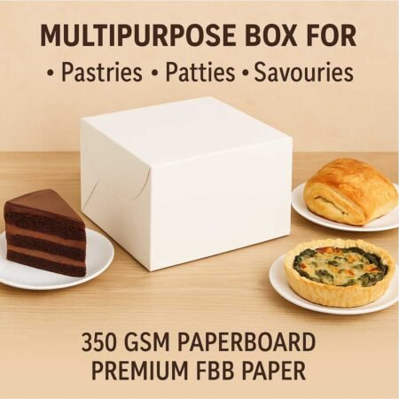 Crafted from premium food-grade paper board, it balances durability with finesse — ideal not just for bakeries and cafés, but also for return favours, party giveaways, baby showers, or gifting handmade goodies. The neutral white tone adds a touch of elegance to any occasion, letting you customise with ribbons, stickers, or stamps to match your theme.