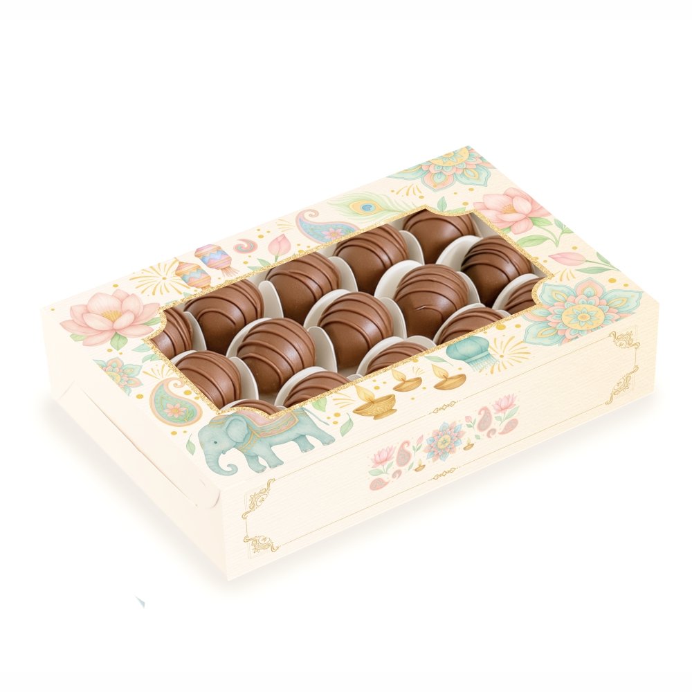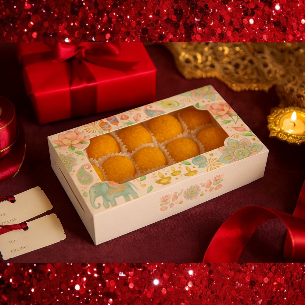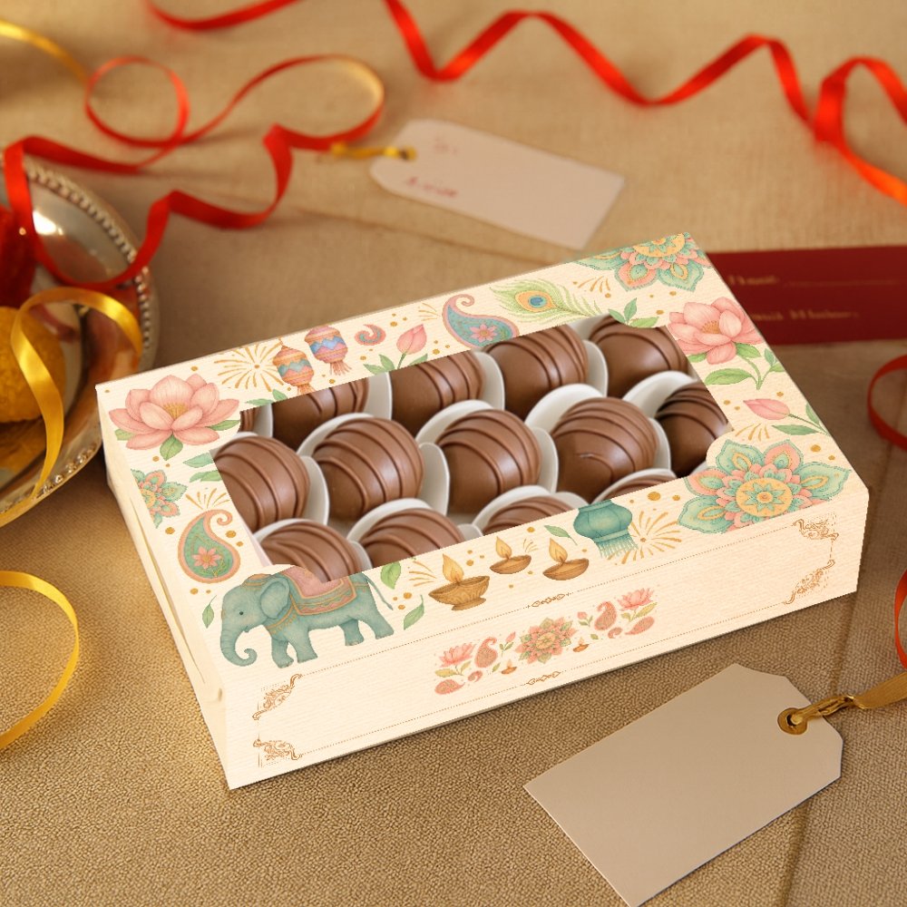 This Diwali, gift happiness in the sweetest way possible! Our beautifully crafted festive box is designed to hold your favorite treats – from rich, fudgy brownies to traditional motichoor ladoos or premium chocolates. Decorated with pastel florals, diyas, and festive motifs like the royal elephant and lotus, the box brings out the true spirit of Diwali.