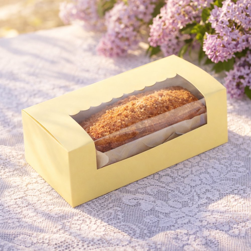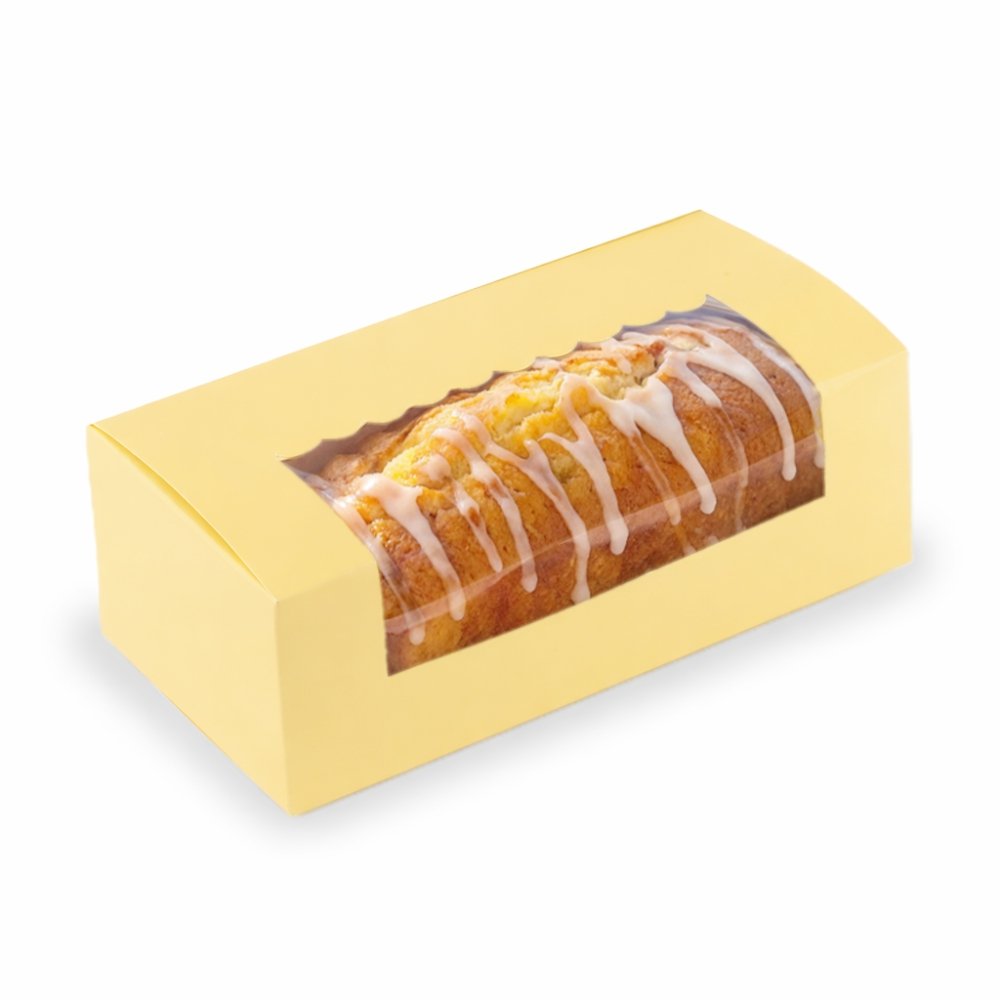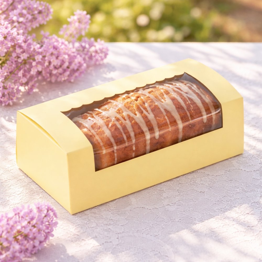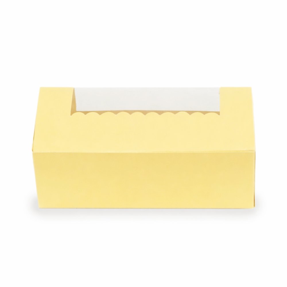 Your specially baked tea-time cakes or cookies got to be packaged in a special way! Take a look at this premium loaf cake box by Chic a Choc, which showcases an alluring pastel yellow colour that is sure to tempt the viewers to savour your tasty loaf cake or cookies placed inside. Designed with care and perfection using high-quality paper food grade board, the box is super sturdy, while also being easy to hold and carry around. A scallop designed window on top is for your customers to have a perfect glimpse of your loaf cake.