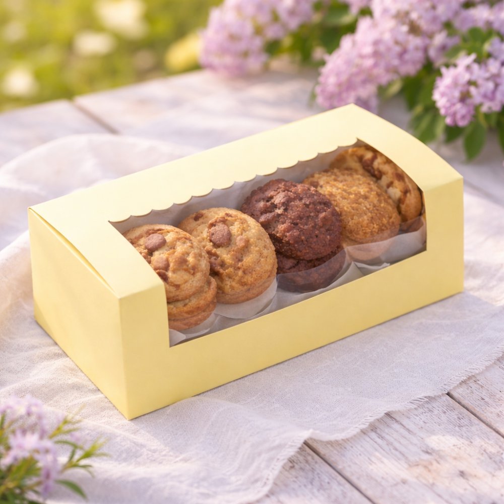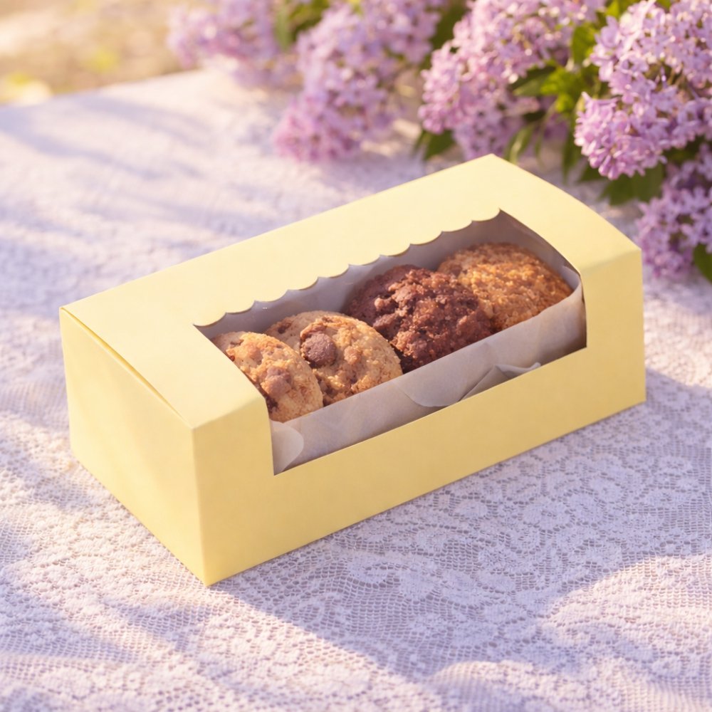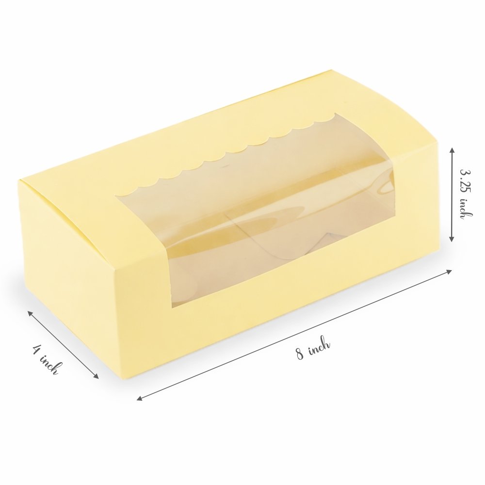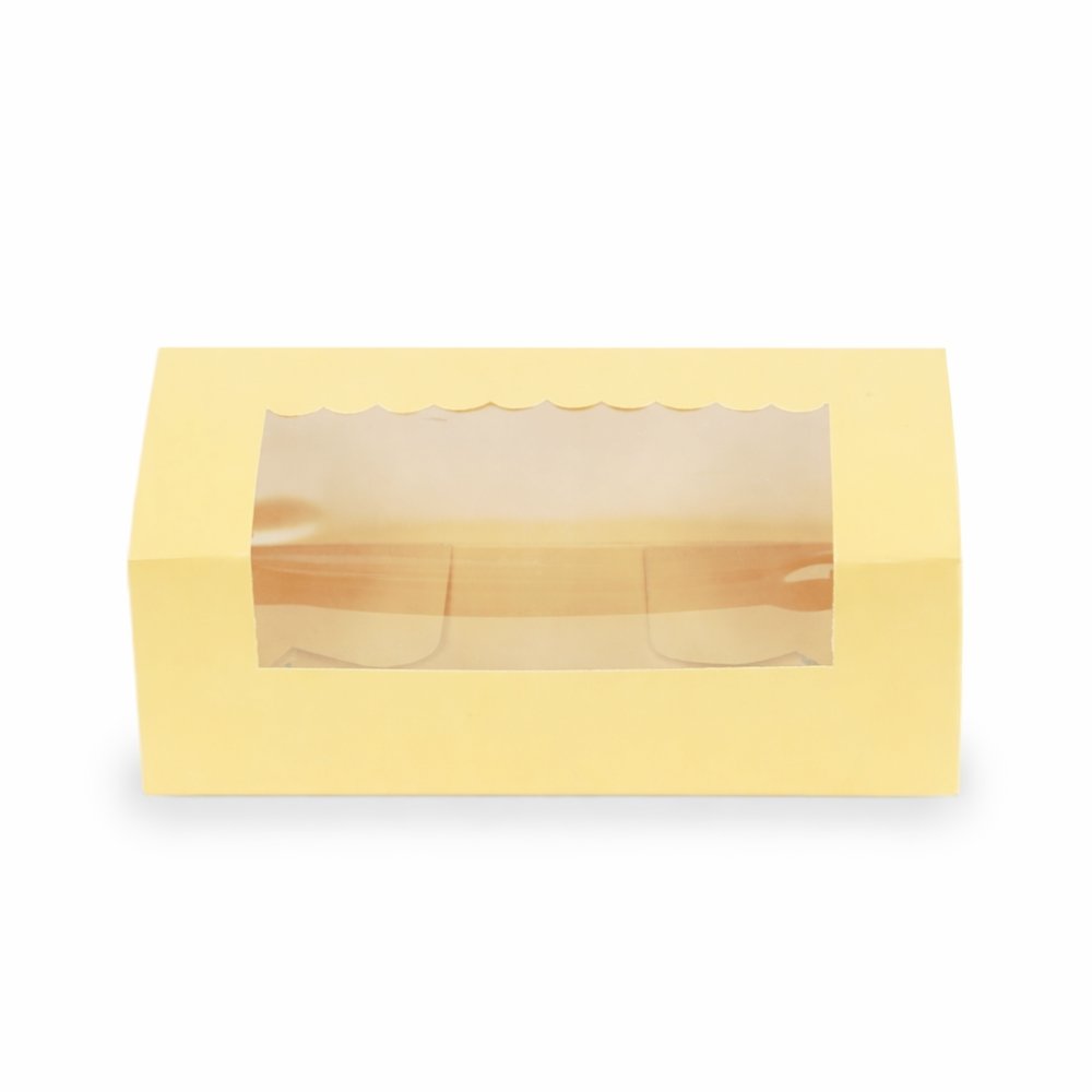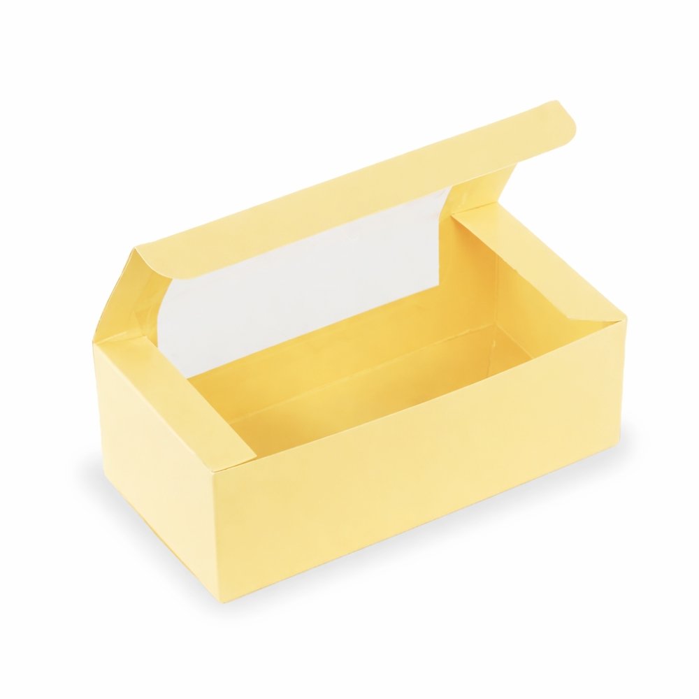 Your specially baked tea-time cakes or cookies got to be packaged in a special way! Take a look at this premium loaf cake box by Chic a Choc, which showcases an alluring pastel yellow colour that is sure to tempt the viewers to savour your tasty loaf cake or cookies placed inside. Designed with care and perfection using high-quality paper food grade board, the box is super sturdy, while also being easy to hold and carry around. A scallop designed window on top is for your customers to have a perfect glimpse of your loaf cake.